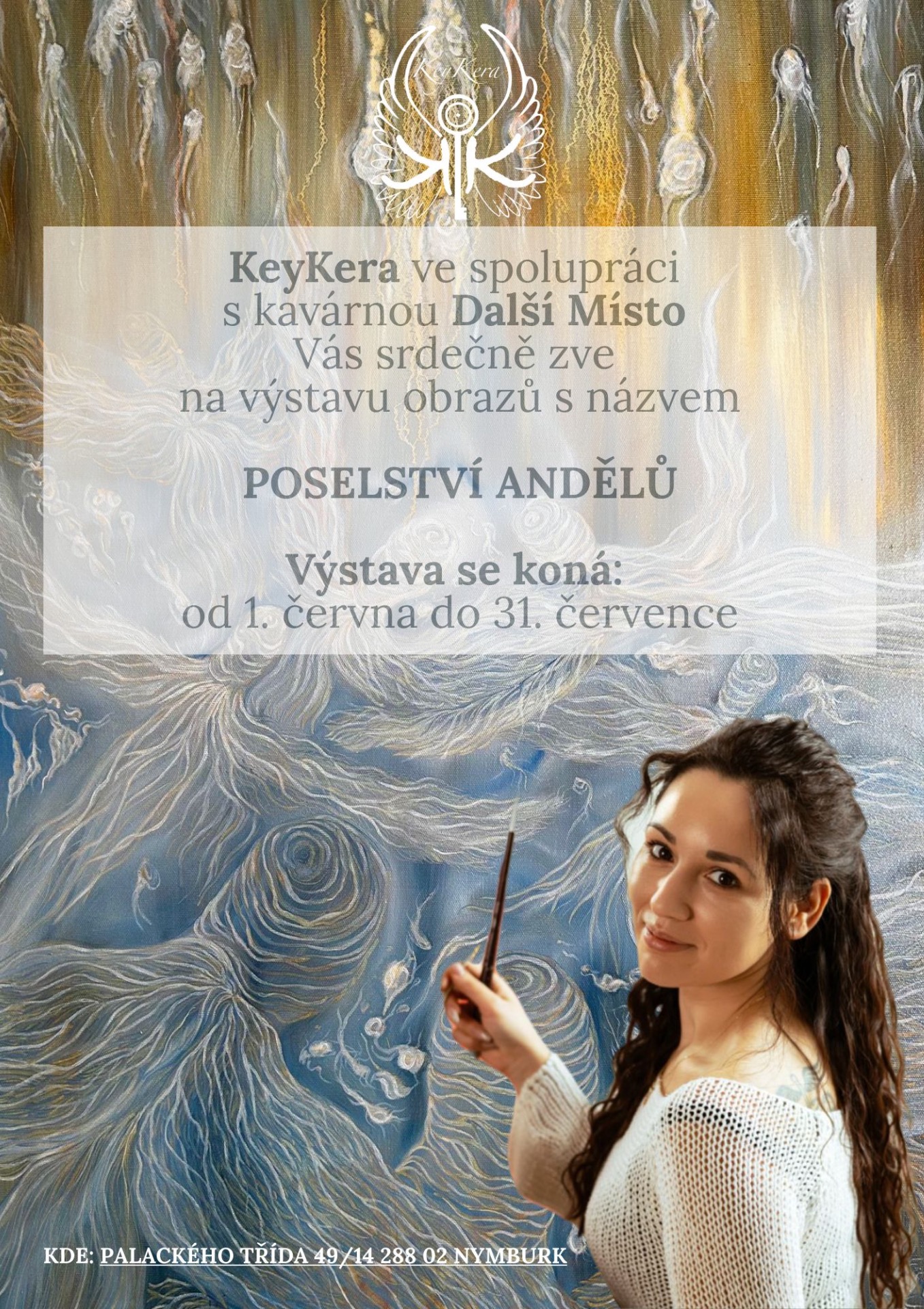 Ve městě Nymburk, v místní nejoblíbenější kavárně Další Místo, pořádá umělkyně Keykera - Nikola Lazarová výstavu obrazů s názvem Poselství Andělů. Její tvorba nabízí široké spektrum pohledů na mystické bytosti. Přijďte se nechat unést tajemnem a prožijte inspirativní chvíle v obklopení umění se svou rodinou či přáteli.
