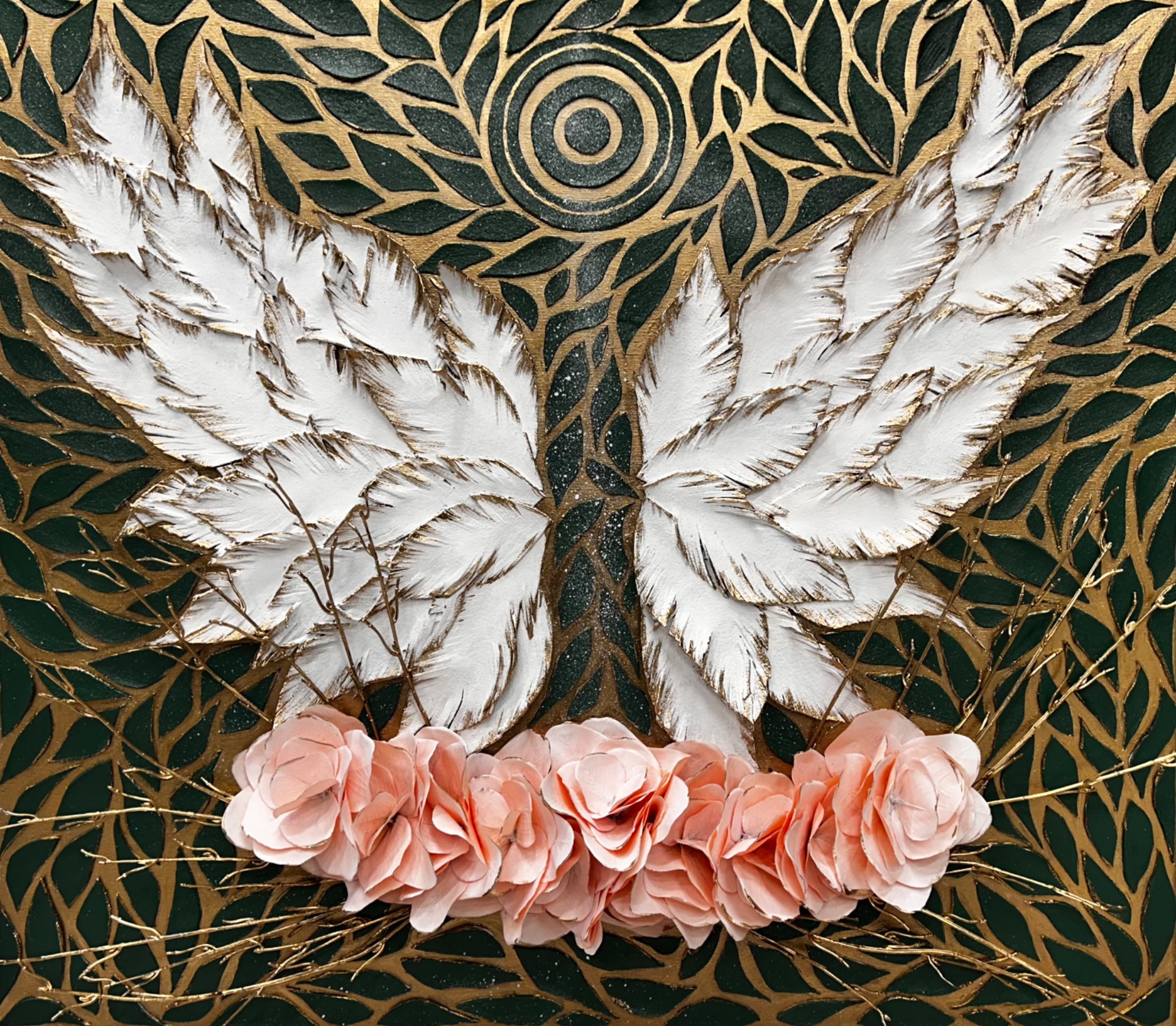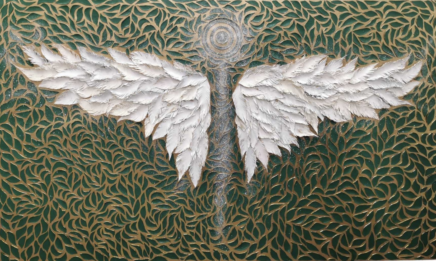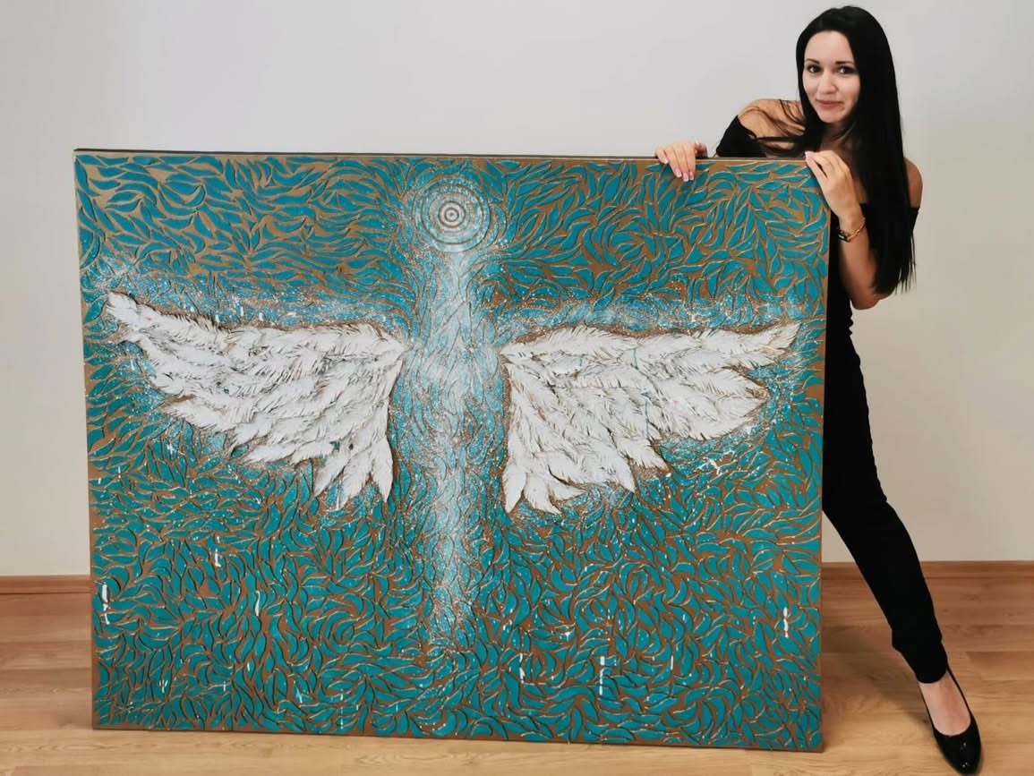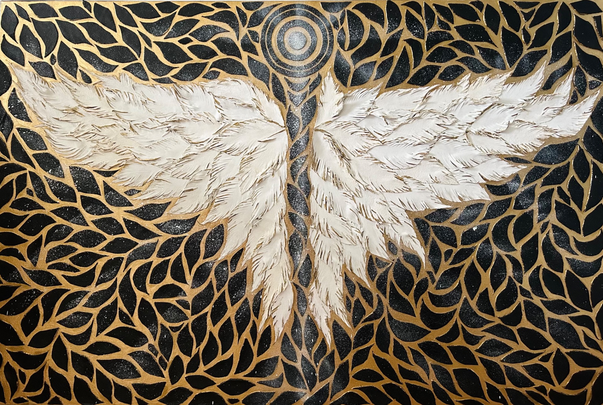 Jeho křídla a pozadí celého obrazu zdobí třpytivá zlatavá barva - symbol hojnosti, ochrany a lásky. Září do prostoru, léčí a otevírá srdce.