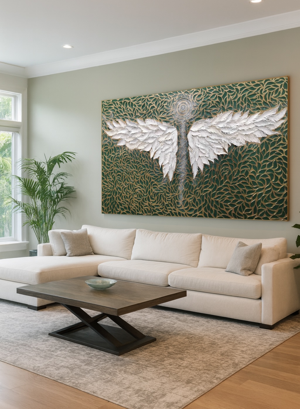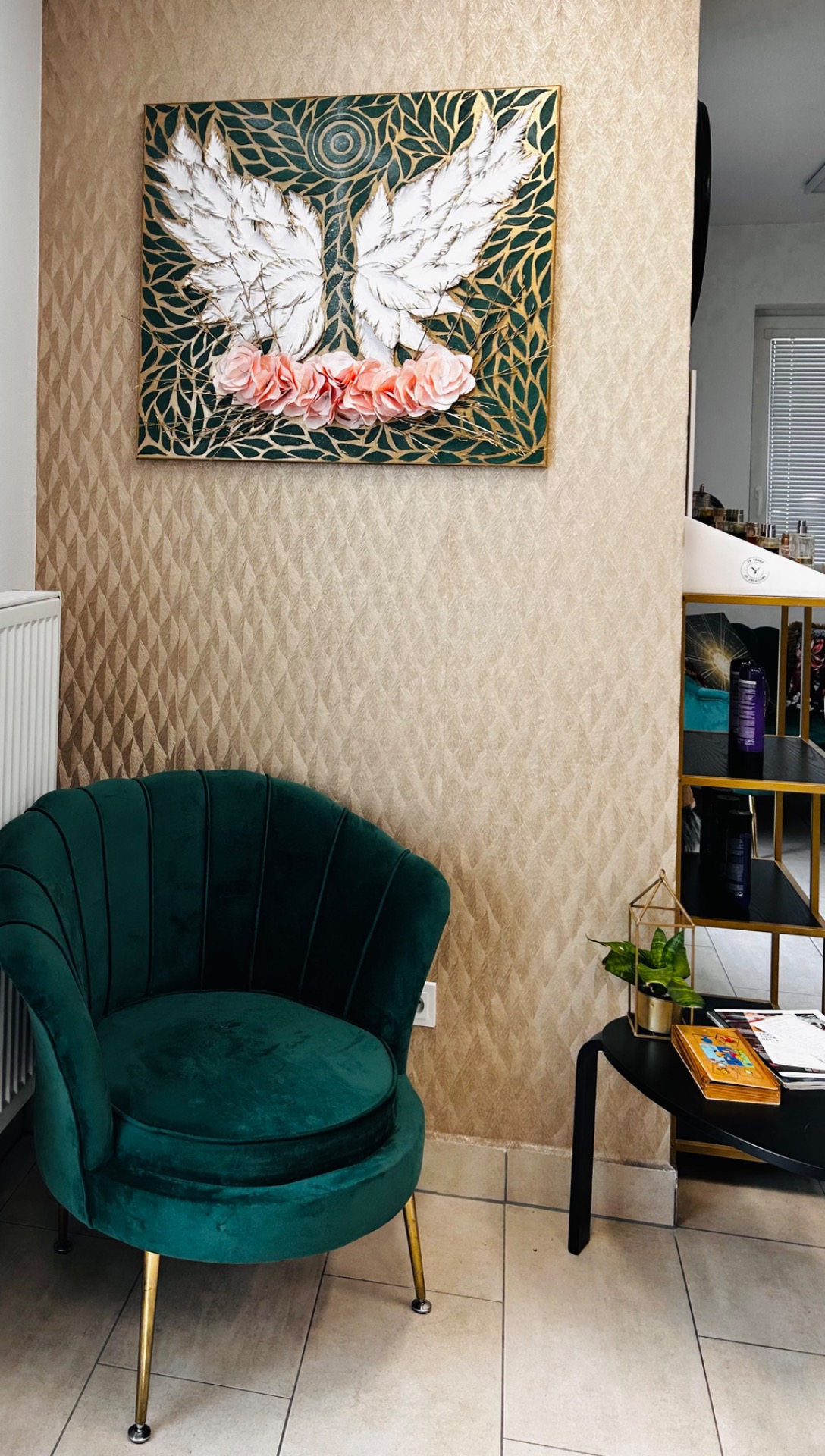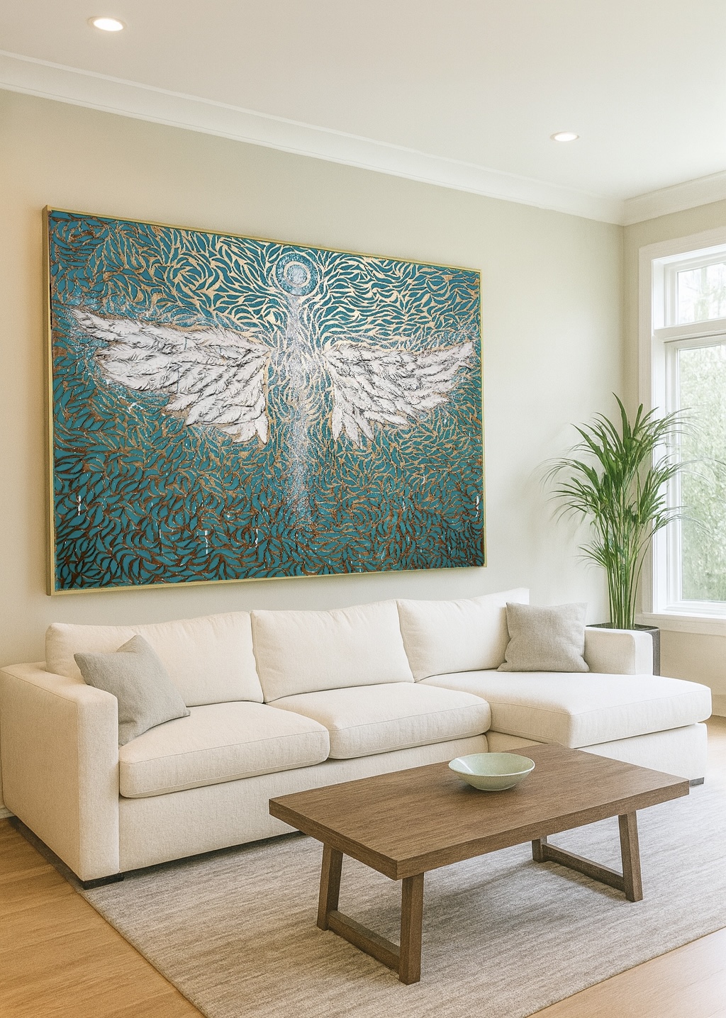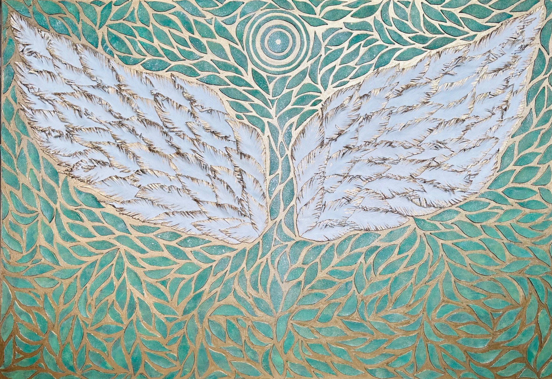 Jeho křídla a pozadí celého obrazu zdobí třpytivá zlatavá barva - symbol hojnosti, ochrany a lásky. Září do prostoru, léčí a otevírá srdce.