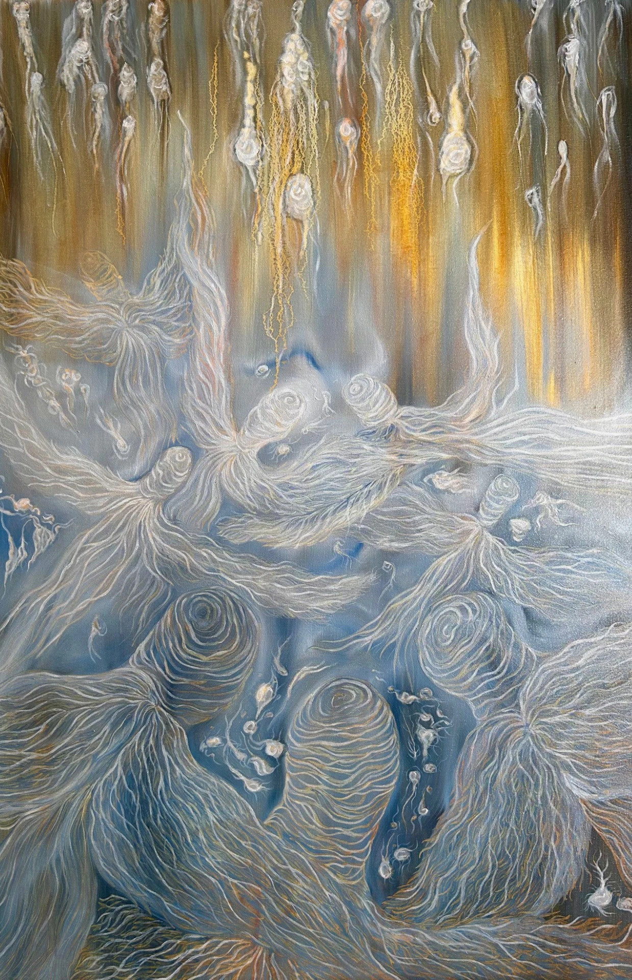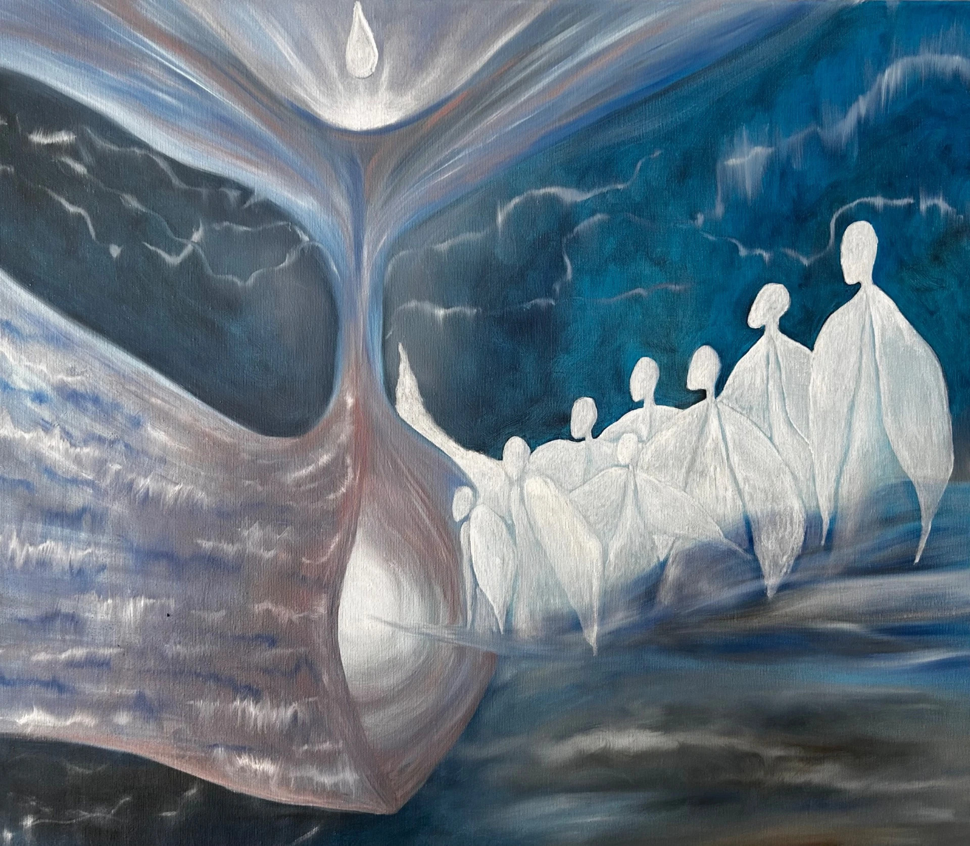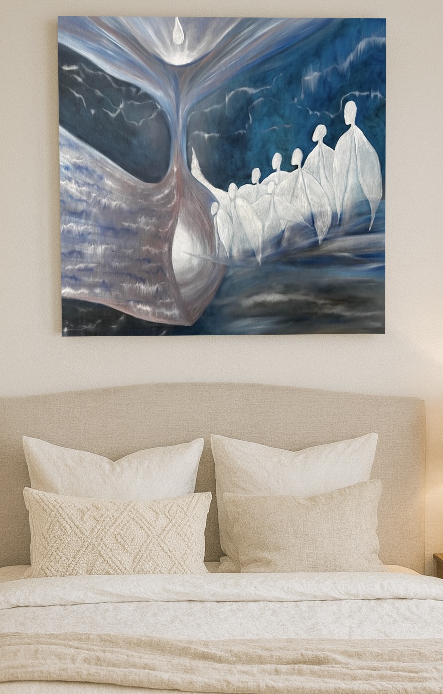 Obraz zachycuje okamžik, kdy se před námi otevírá průchod do jiných světů. Bílé bytosti symbolizují duše na cestě, které s lehkostí kráčejí proudem energie směrem k vyššímu světlu. Kapka nahoře je znakem prvotní esence života, která tvoří most mezi viditelným a neviditelným. Celé dílo vypráví o odvaze vydat se na cestu za hranice známého, o důvěře v proud, který nás vede k novým obzorům.