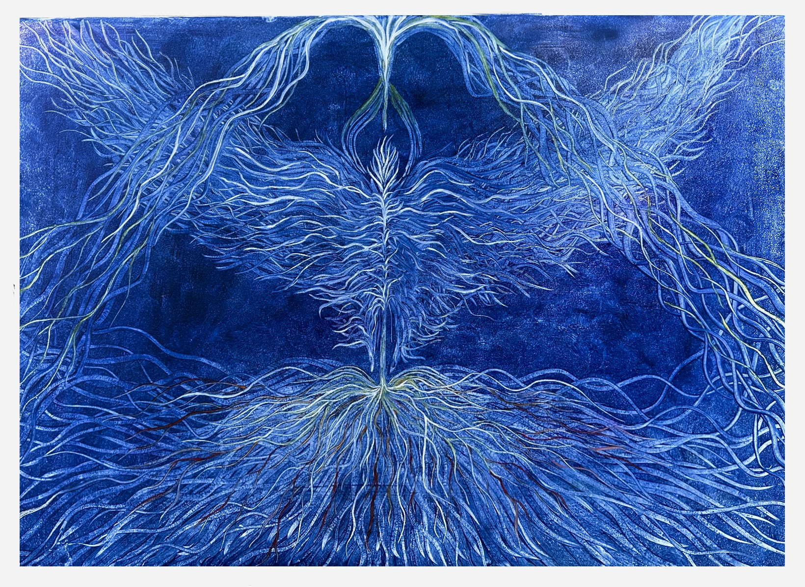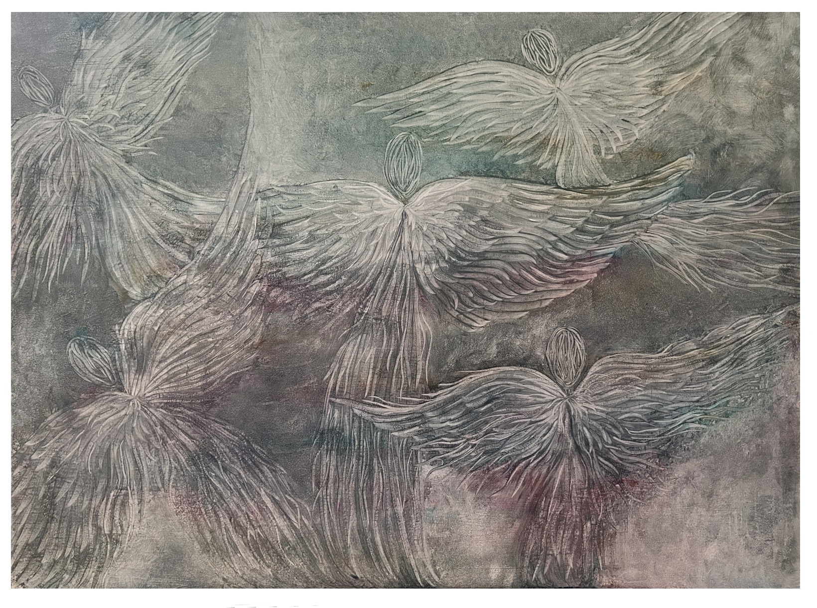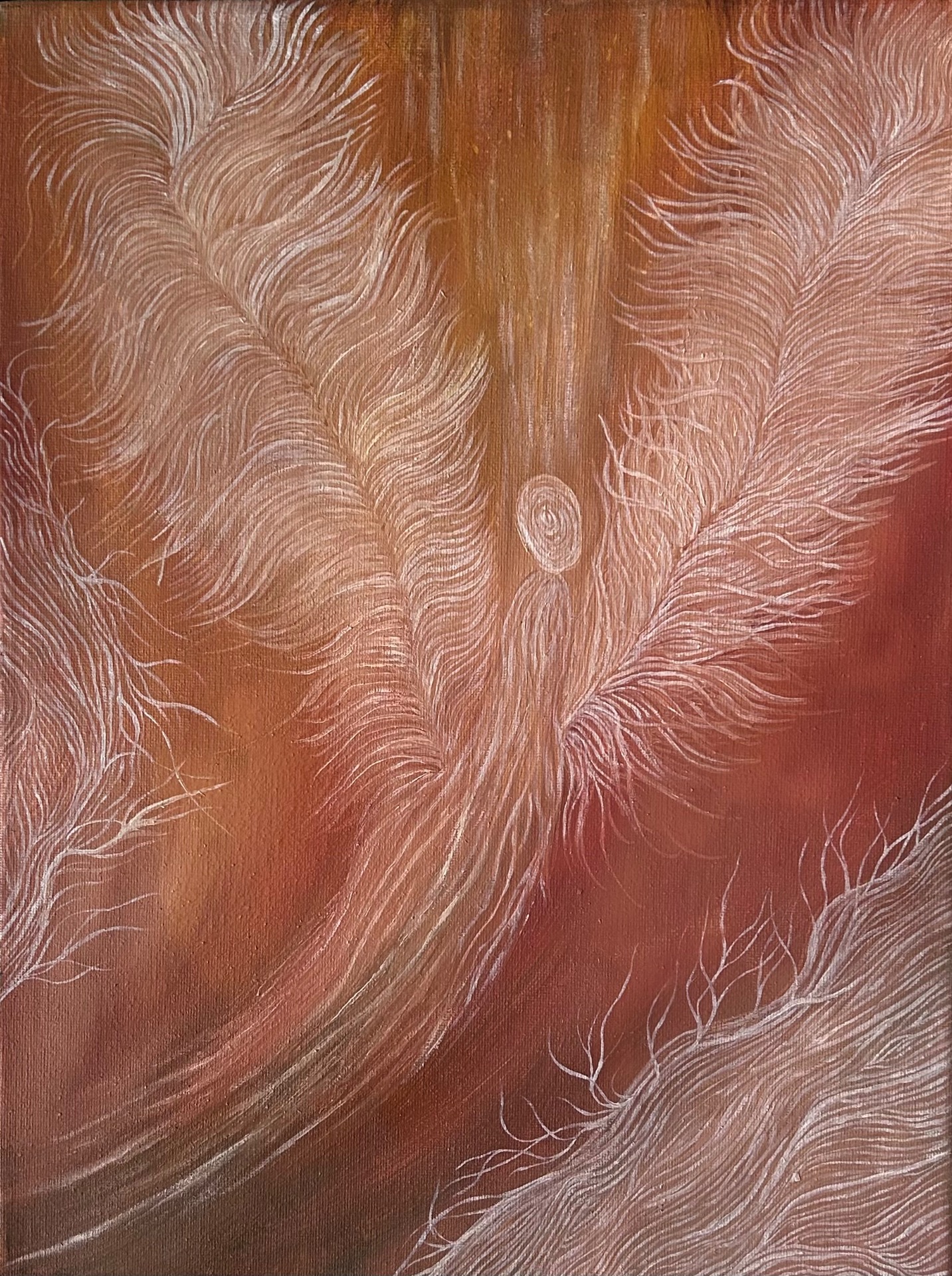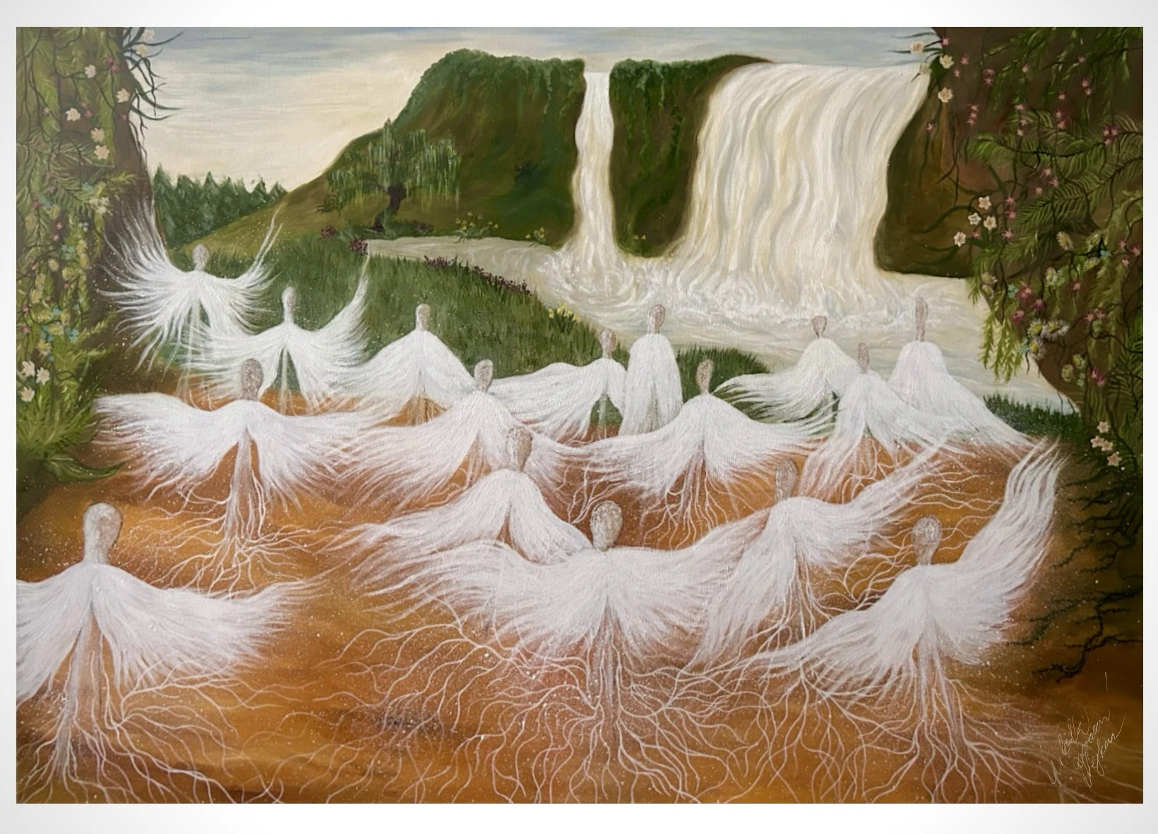 Obraz zachycuje okamžik, kdy se před námi otevírá průchod do jiných světů. Bílé bytosti symbolizují duše na cestě, které s lehkostí kráčejí proudem energie směrem k vyššímu světlu. Kapka nahoře je znakem prvotní esence života, která tvoří most mezi viditelným a neviditelným. Celé dílo vypráví o odvaze vydat se na cestu za hranice známého, o důvěře v proud, který nás vede k novým obzorům.