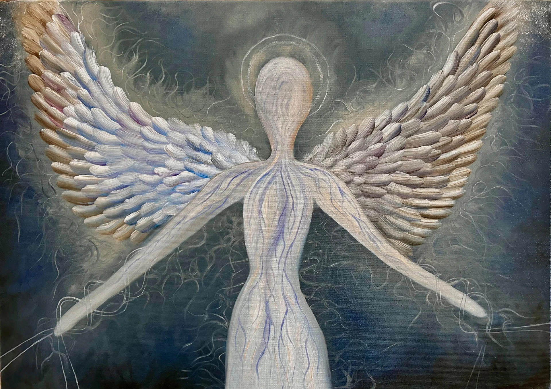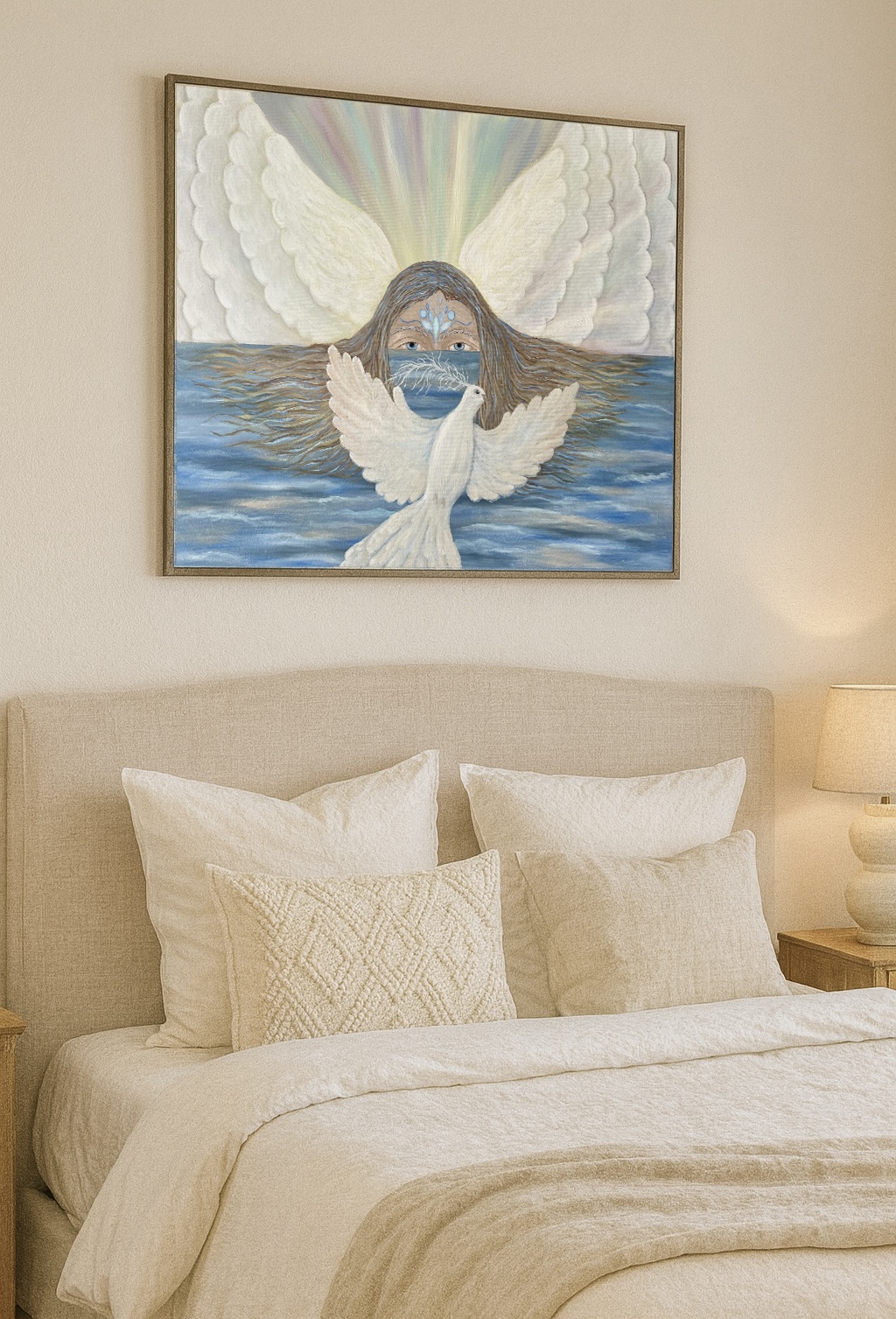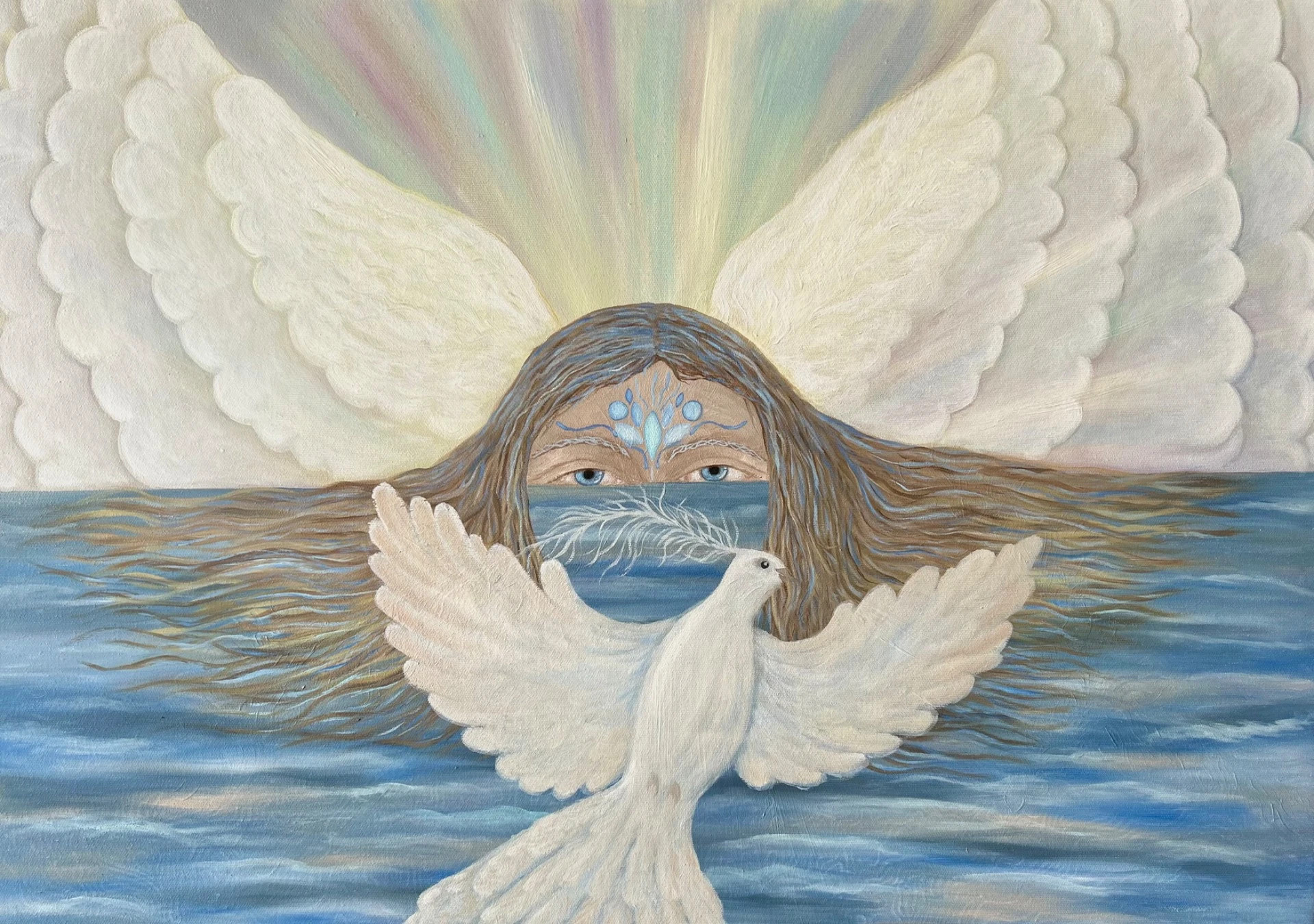 V obraze se zrcadlí spojení nebes a země, lidského a božského. Z očí ženy vyzařuje hluboká moudrost, její vlasy se spojují s proudem vody – symbolem emocí a vědomí. Holubice jako posel míru přináší do prostoru čistotu a naději. Nad celou scénou se rozprostírají andělská křídla a paprsky světla, které chrání a zároveň otevírají bránu k vyšším dimenzím.