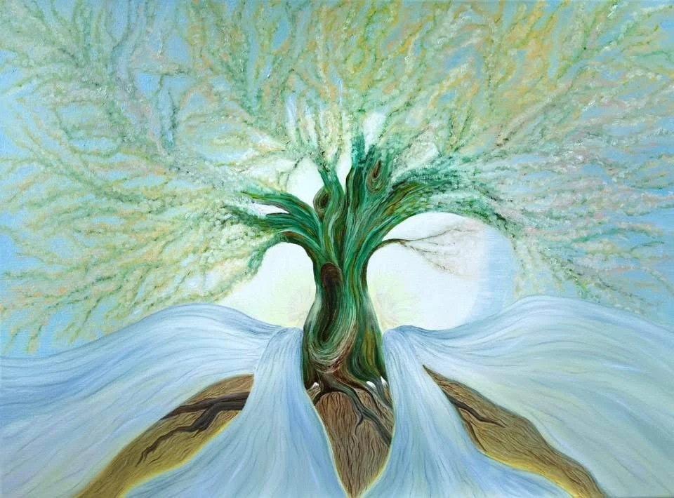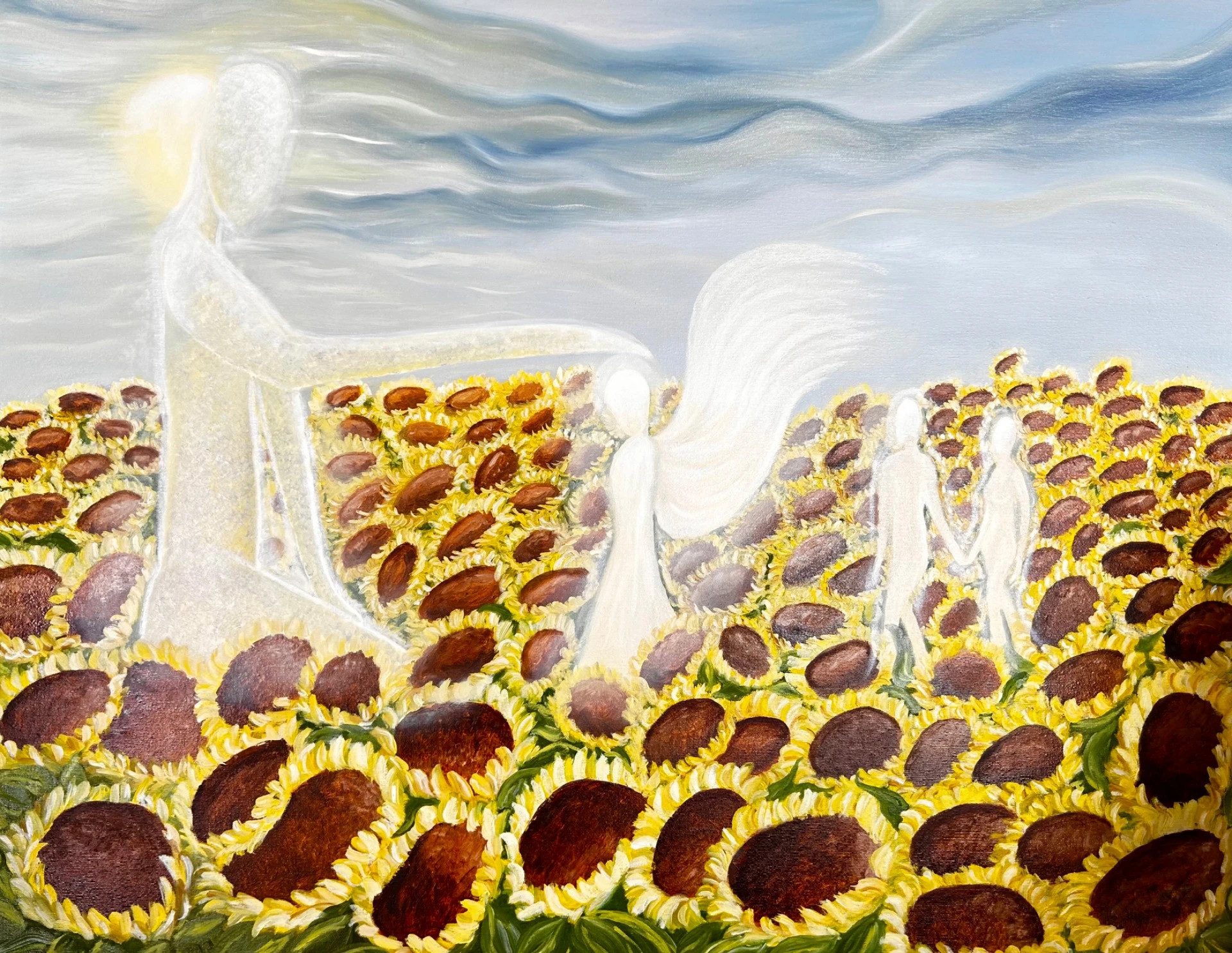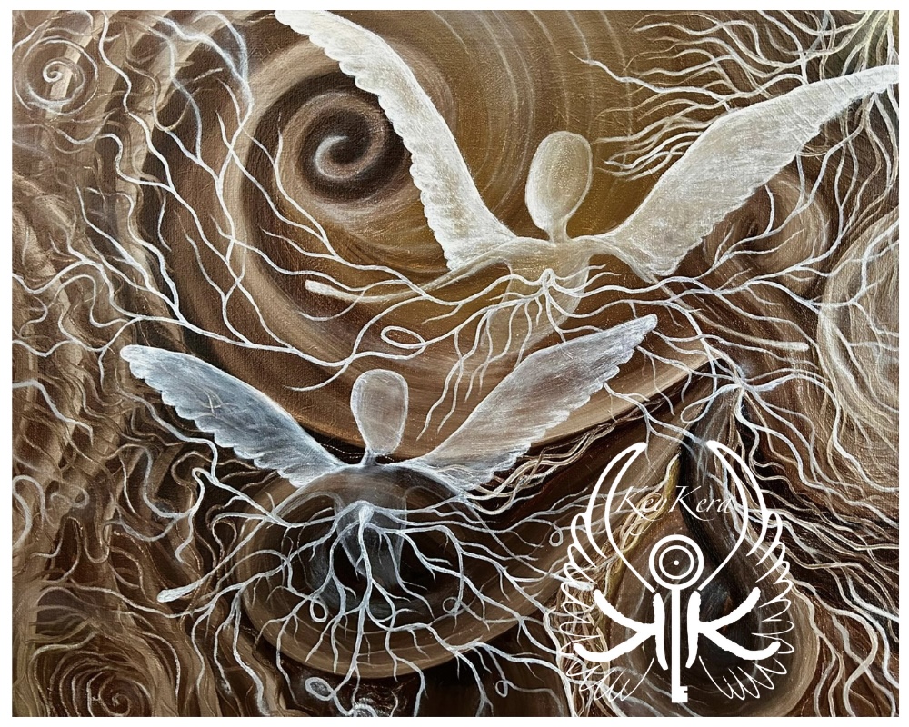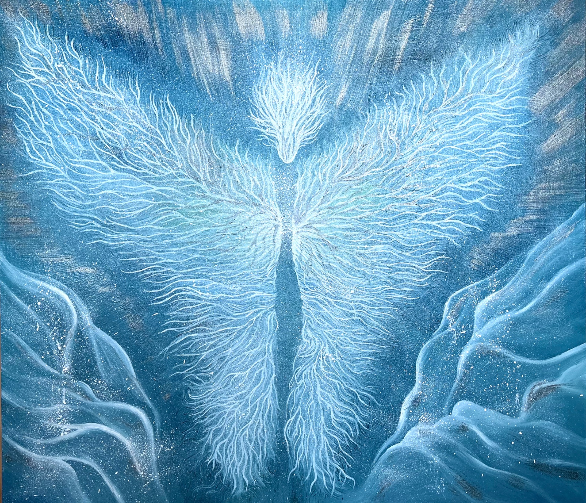 V obraze se zrcadlí spojení nebes a země, lidského a božského. Z očí ženy vyzařuje hluboká moudrost, její vlasy se spojují s proudem vody – symbolem emocí a vědomí. Holubice jako posel míru přináší do prostoru čistotu a naději. Nad celou scénou se rozprostírají andělská křídla a paprsky světla, které chrání a zároveň otevírají bránu k vyšším dimenzím.