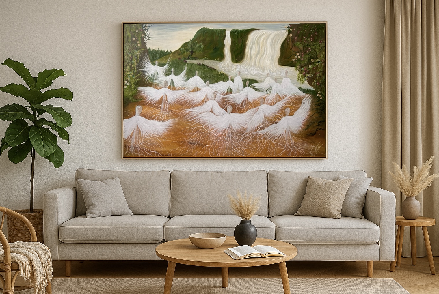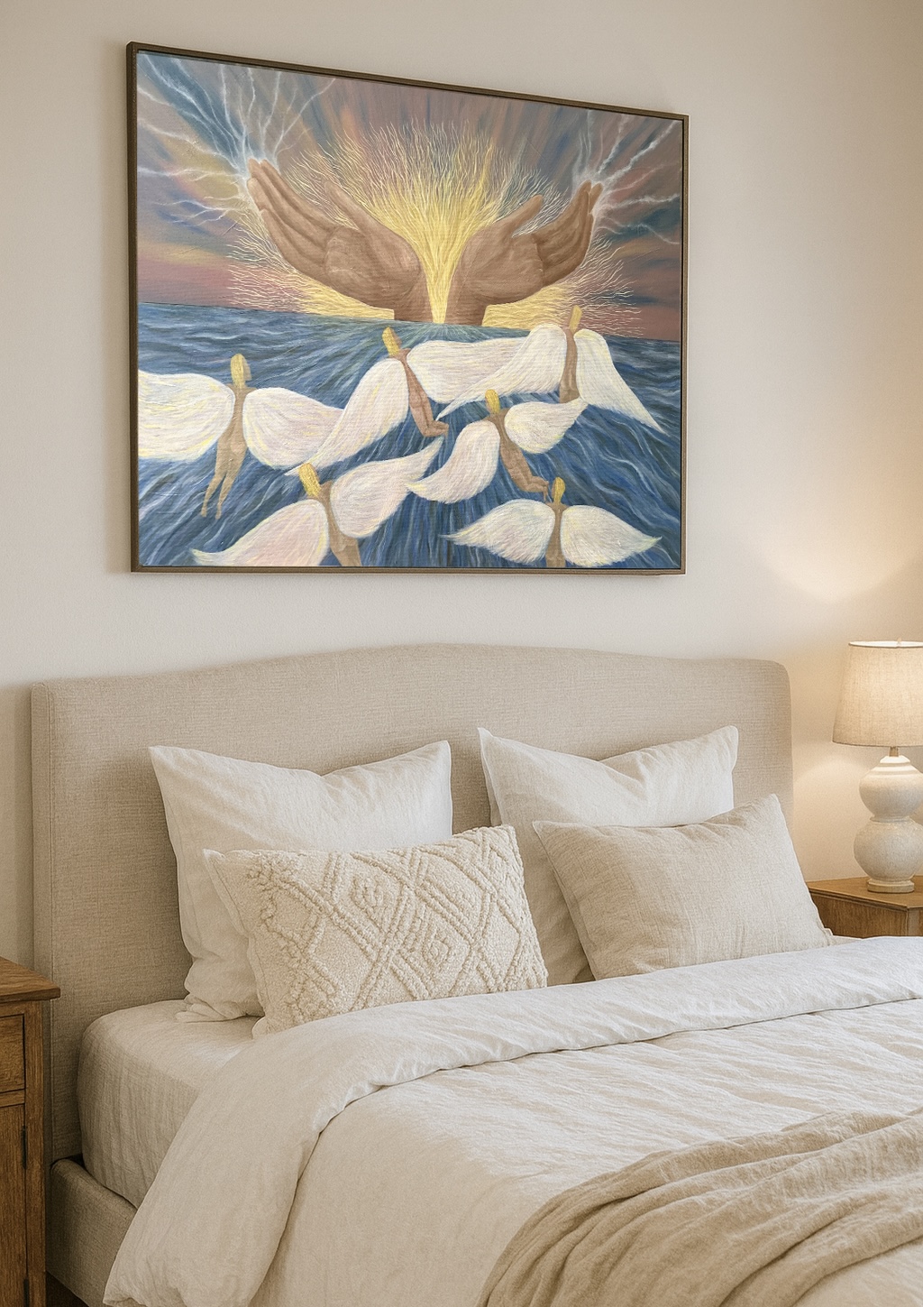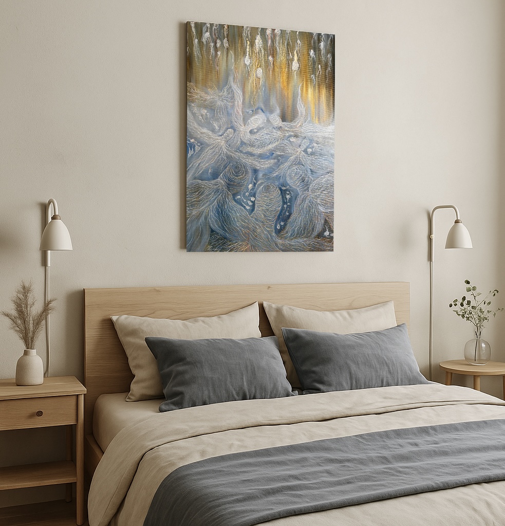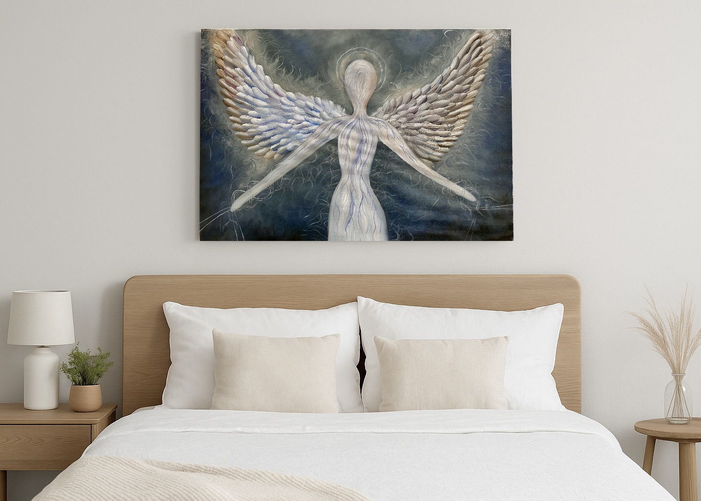 Tento obraz je vizuálním poselstvím ochrany, vedení a návratu k božskému zdroji. Ztvárňuje andělské bytosti, které směřují k otevřené náruči světla – k rukám symbolizujícím bezpodmínečnou lásku, přijetí a vyšší sílu, která nás objímá i v těch nejhlubších vodách života.Dynamické pohyby vody a jemné paprsky světla vytvářejí pocit pohybu, znovuzrození a duchovního návratu domů. Obraz vyzařuje klid, víru i hlubokou naději.Obraz je ideální do prostor, kde si přejete posílit atmosféru míru, duchovní podpory a ochrany.Skvěle vynikne například v meditačním koutku či jógovém studiu, v ložnici jako symbol klidu a vedení během snění, v terapeutické místnosti či poradně, v obývacím pokoji, kde může navodit pocit harmonie a světla.