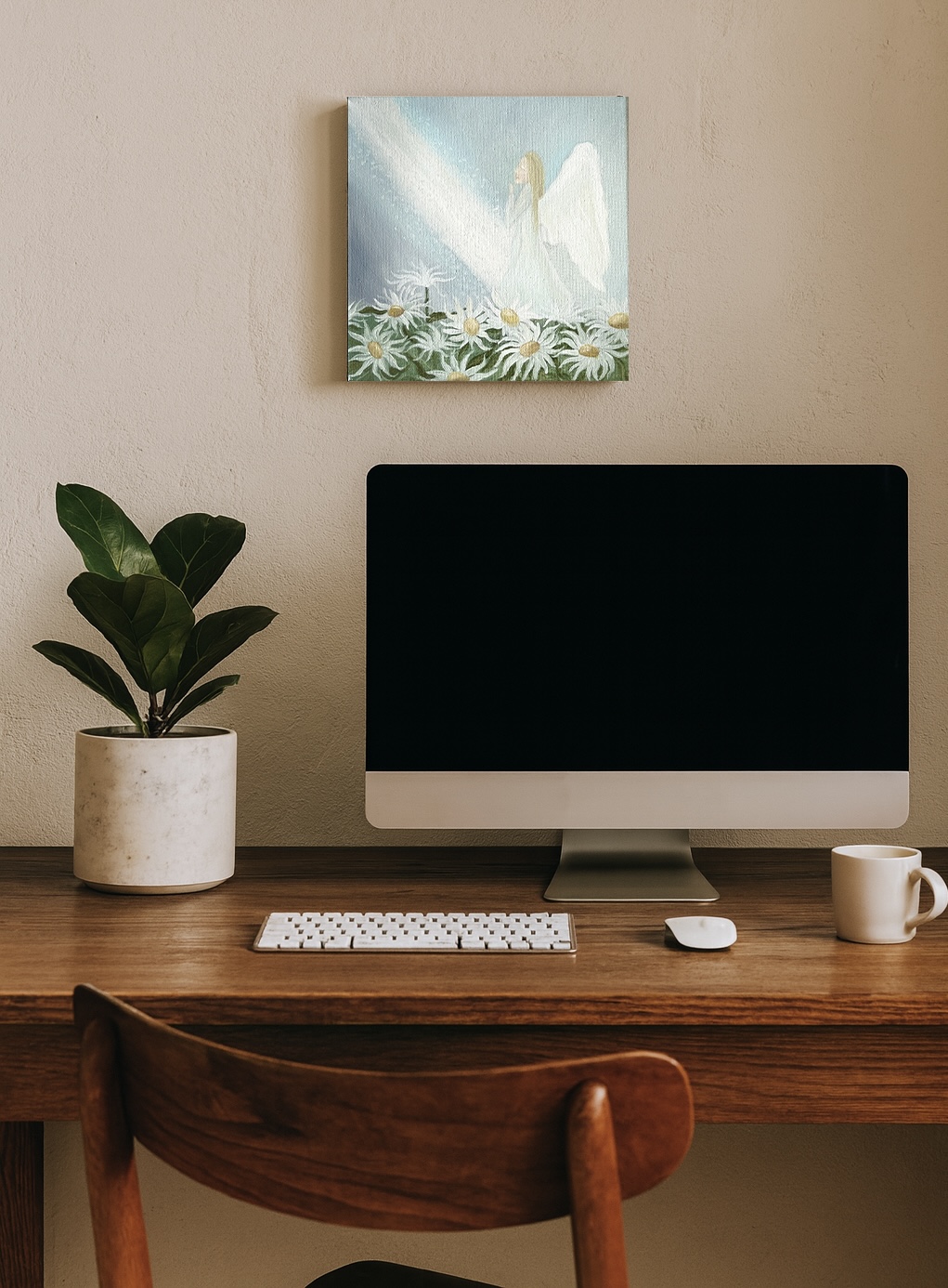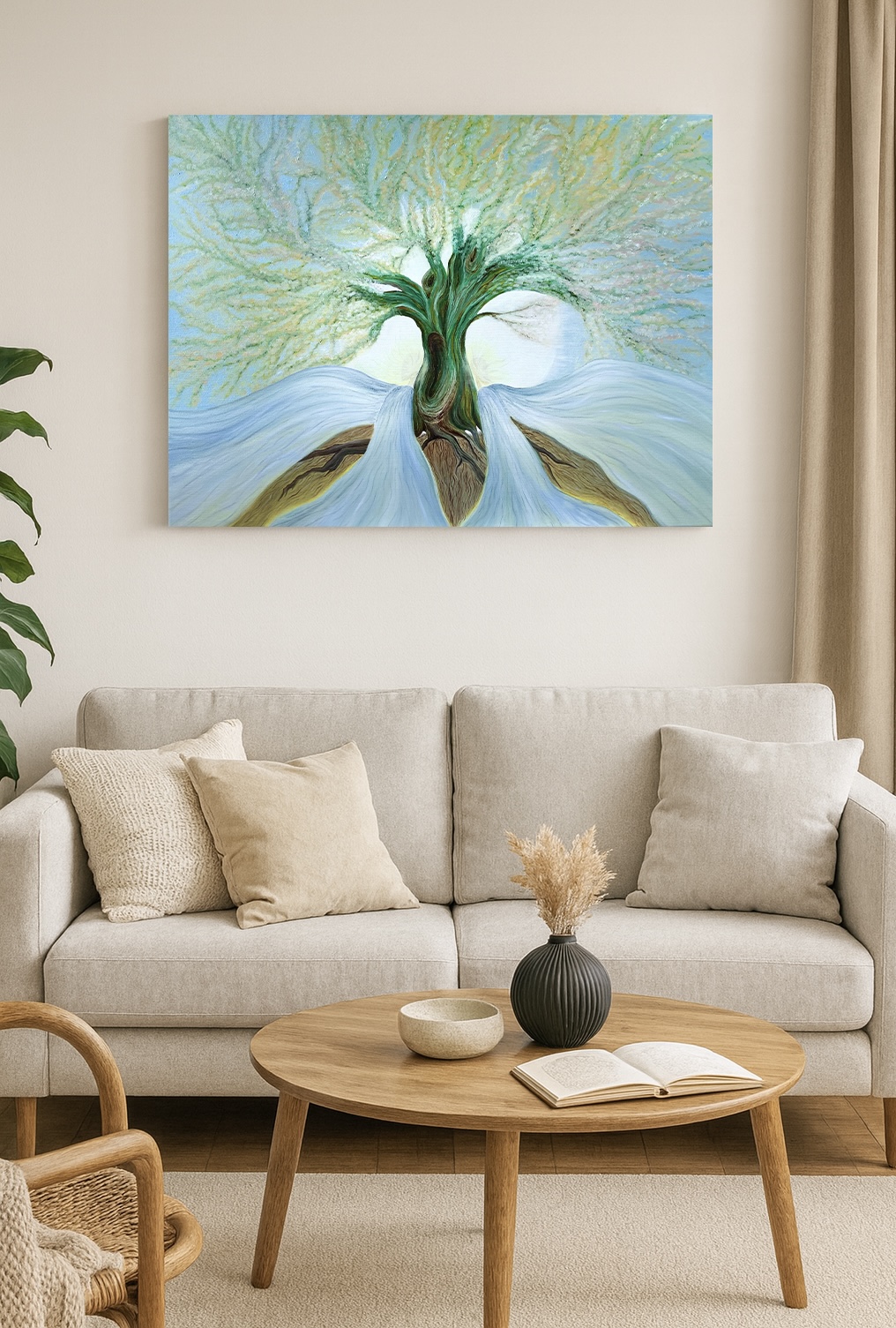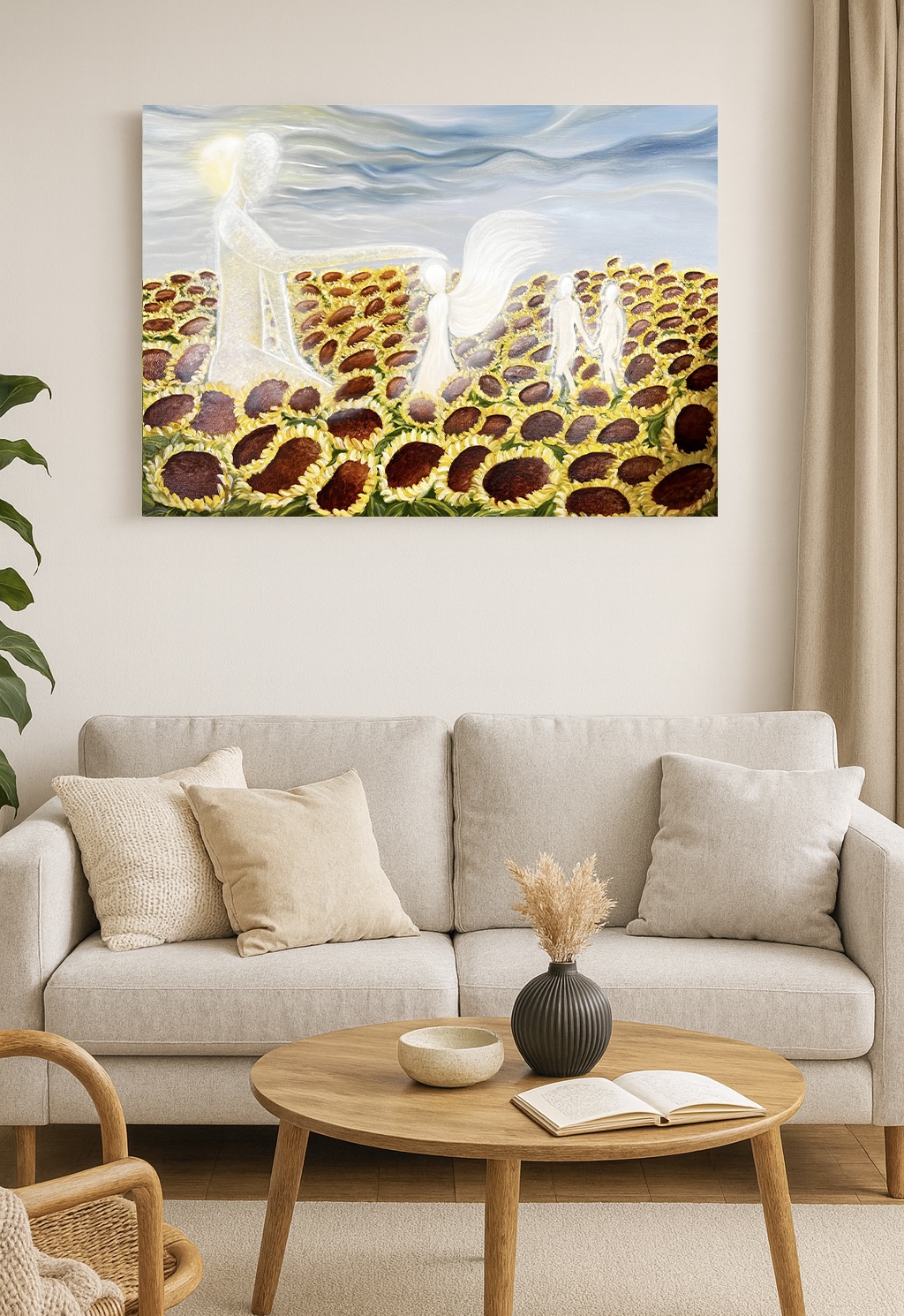 Tento obraz je vizuálním poselstvím ochrany, vedení a návratu k božskému zdroji. Ztvárňuje andělské bytosti, které směřují k otevřené náruči světla – k rukám symbolizujícím bezpodmínečnou lásku, přijetí a vyšší sílu, která nás objímá i v těch nejhlubších vodách života.Dynamické pohyby vody a jemné paprsky světla vytvářejí pocit pohybu, znovuzrození a duchovního návratu domů. Obraz vyzařuje klid, víru i hlubokou naději.Obraz je ideální do prostor, kde si přejete posílit atmosféru míru, duchovní podpory a ochrany.Skvěle vynikne například v meditačním koutku či jógovém studiu, v ložnici jako symbol klidu a vedení během snění, v terapeutické místnosti či poradně, v obývacím pokoji, kde může navodit pocit harmonie a světla.