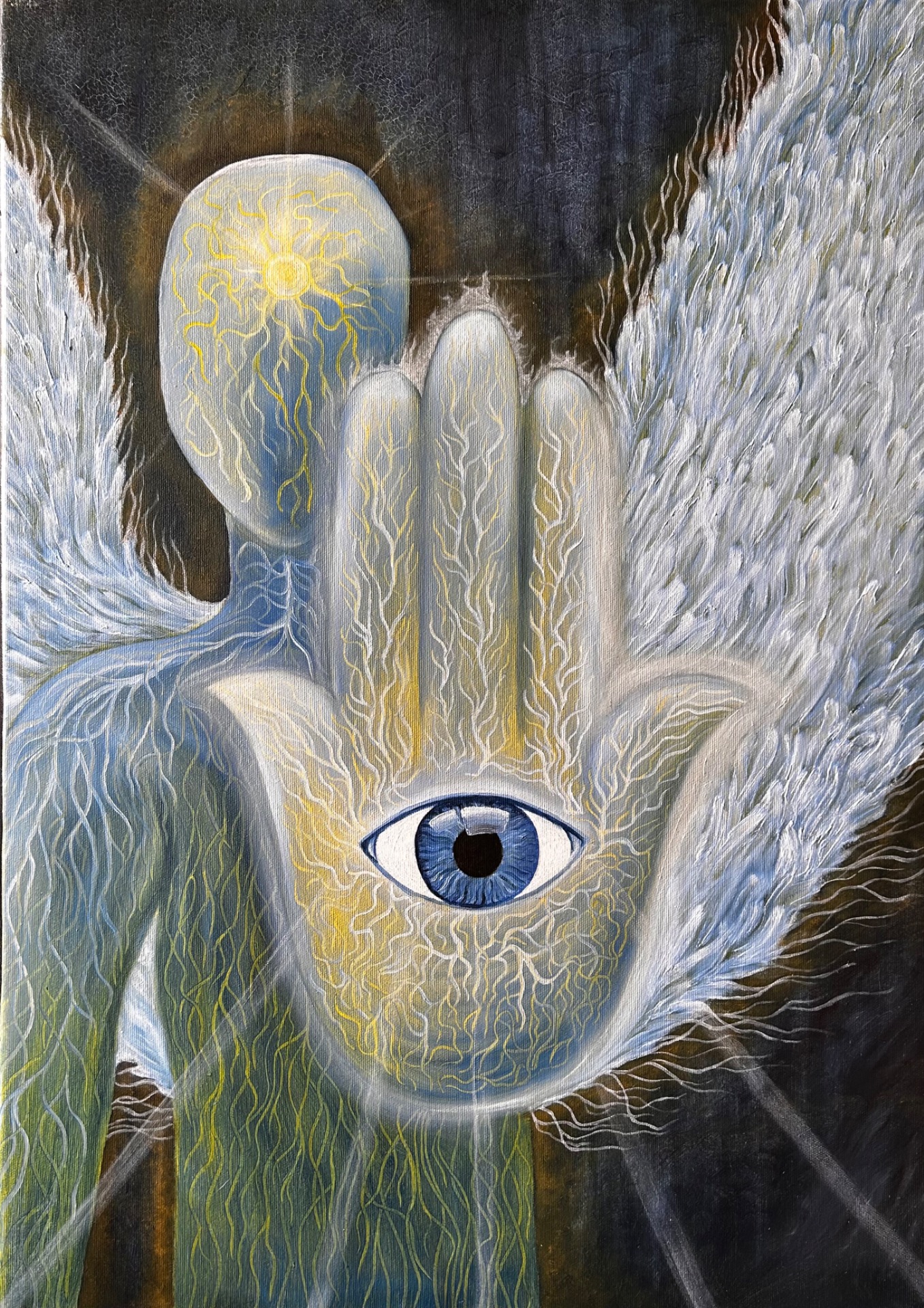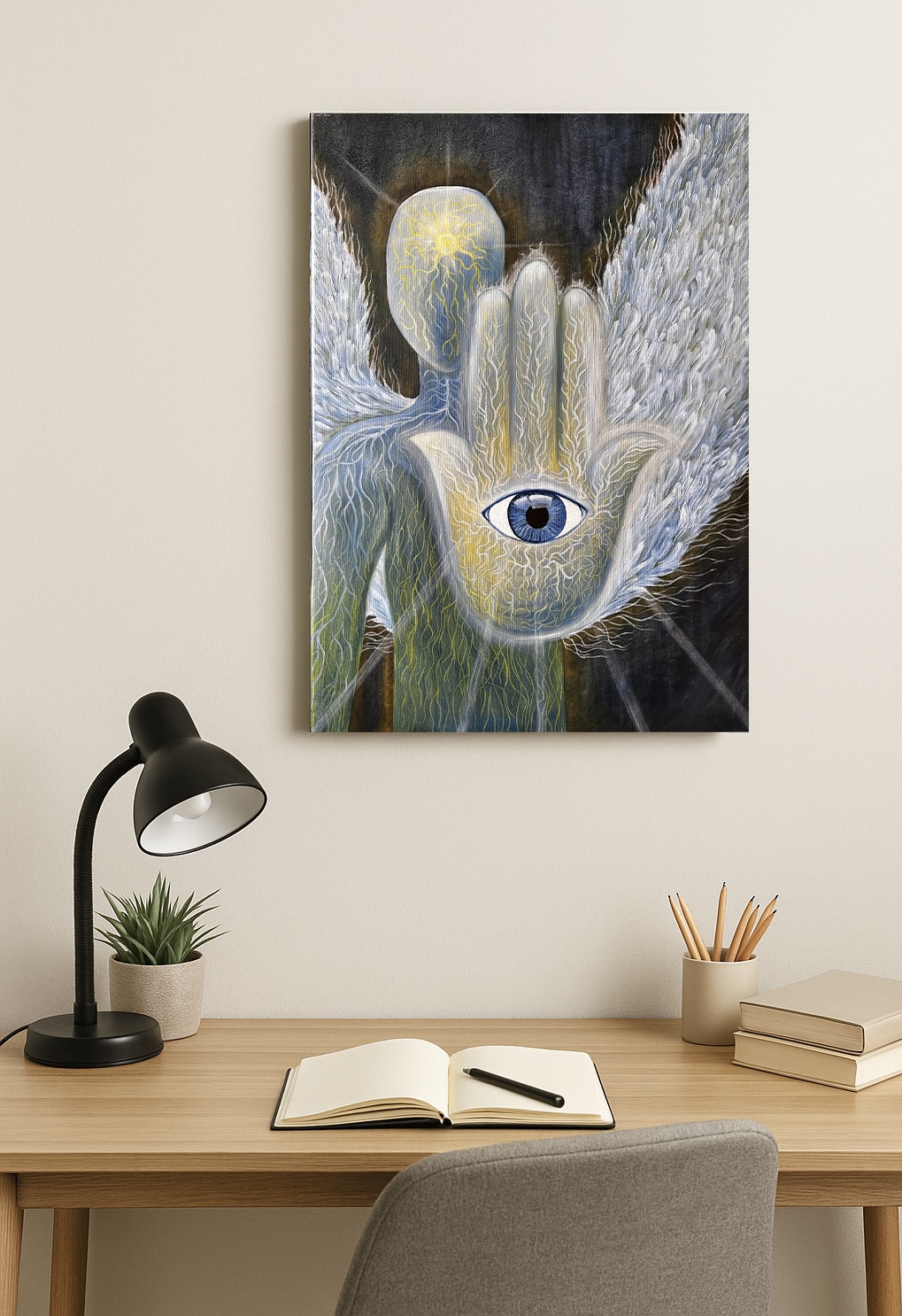 Tajemná bytost světla s andělskými křídly ti klade ruku před oči – ne jako výzvu k zastavení, ale jako pozvání k nahlédnutí hlouběji.Z dlaně vyzařuje oko intuice, strážce vnitřního zření a božské prozřetelnosti.Je to posvátný symbol, známý napříč kulturami jako ochránce před temnotou – odráží negativitu, přitahuje štěstí a probouzí poznání.