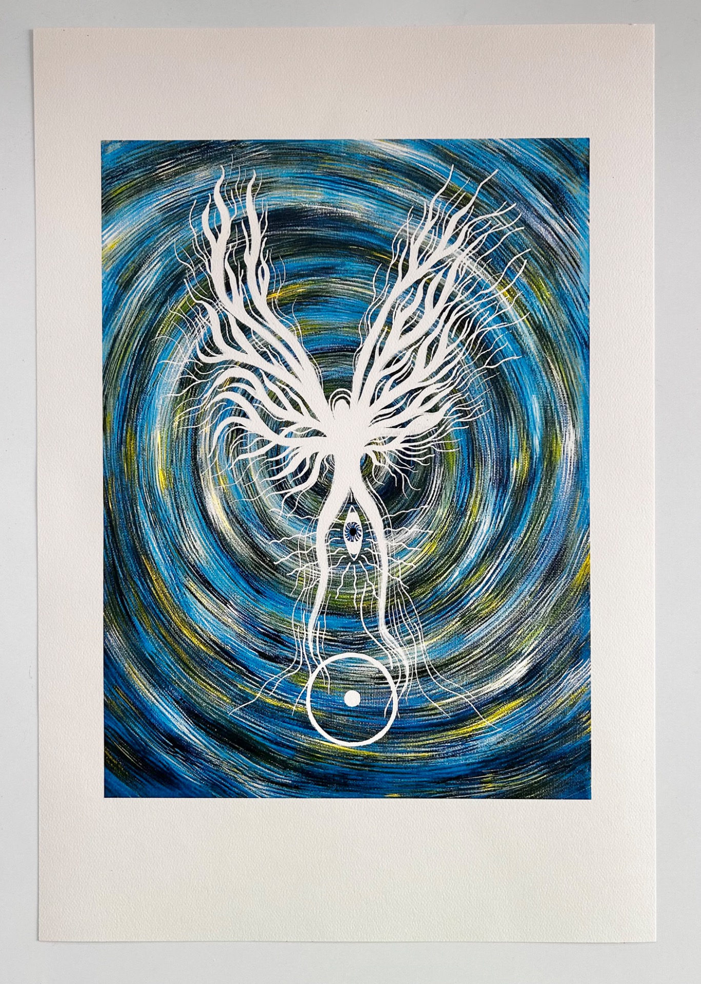 Z hlubin vesmíru vystupuje bytost utkaná ze světla a kořenů — anděl, jehož přítomnost narušuje čas i prostor. Jeho křídla, připomínající větvoví nebo nervové dráhy, se rozprostírají ve spirálovitém víru modři a zlata. V jeho středu je oko bdělosti, které hledí dovnitř i ven zároveň — do duše pozorovatele i do samé podstaty bytí. Kruh s tečkou pod ním symbolizuje zrození, dokonalost a spojení s počátkem všeho. Tento anděl není jen strážcem, ale také klíčem k pochopení skrytého řádu ve zdánlivém chaosu.