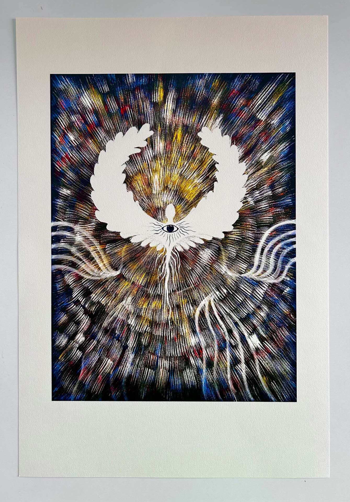 Tento mystický obraz znázorňuje anděla jako zářivou bytost s mohutnými křídly a vševidoucím okem uprostřed hrudi — symbolem vnitřního poznání a božského vědomí. Světlo a barvy vyzařující z jeho těla vytvářejí dojem pohybu, energie a duchovní síly. Anděl se zdá být nejen ochráncem, ale i nositelem vyšší pravdy, která proniká temnotou a probouzí vnitřní světlo v každém, kdo na něj pohlédne.