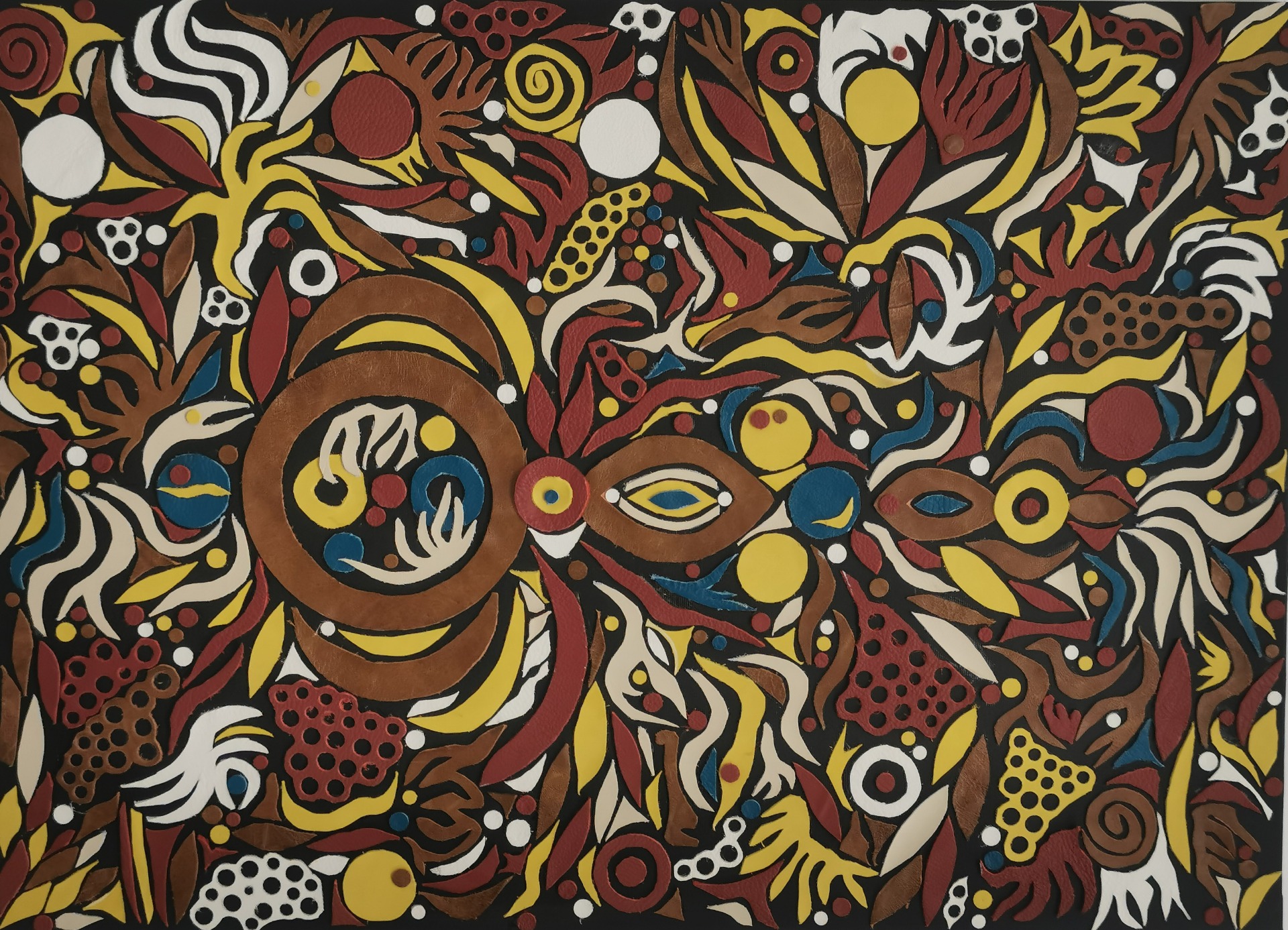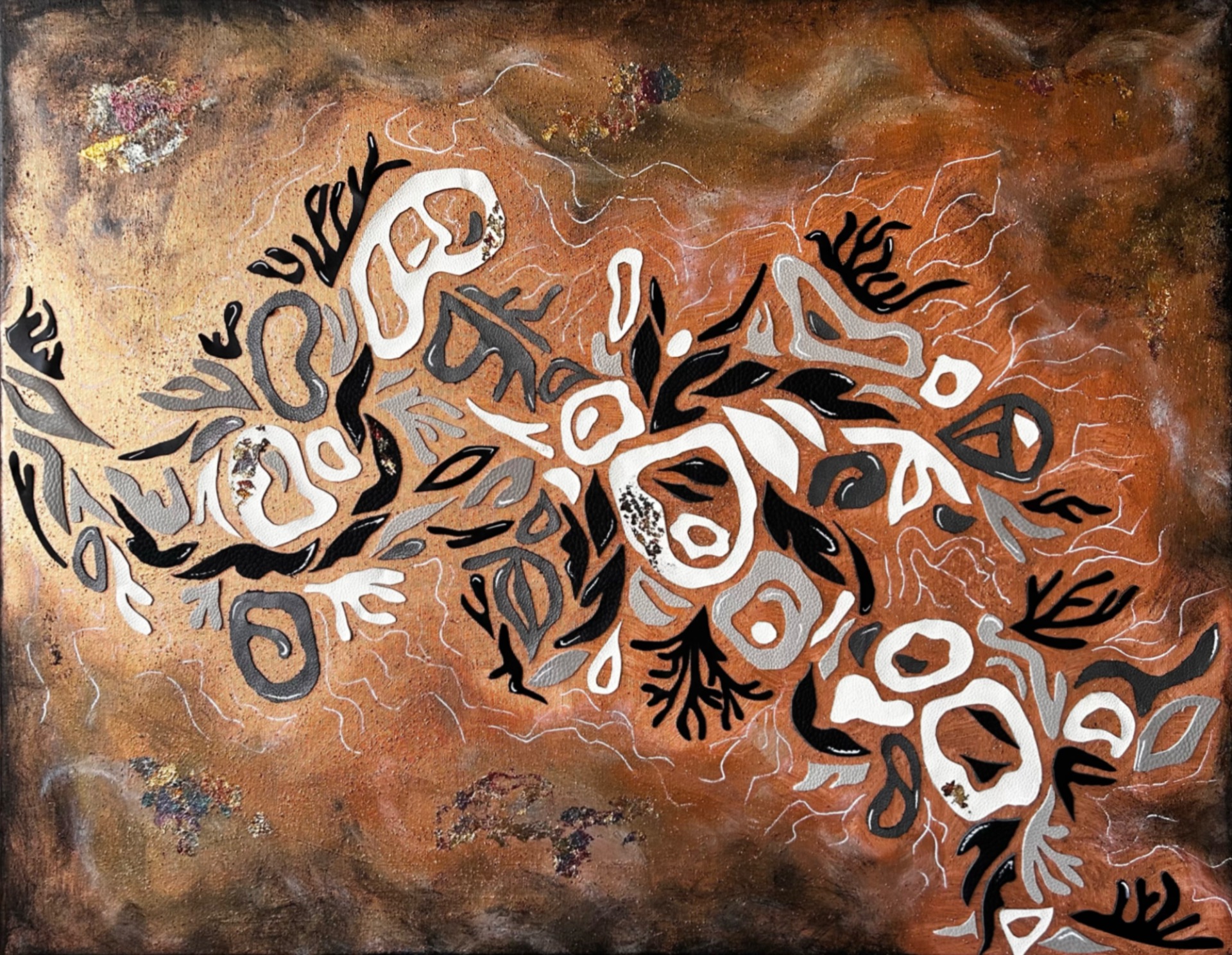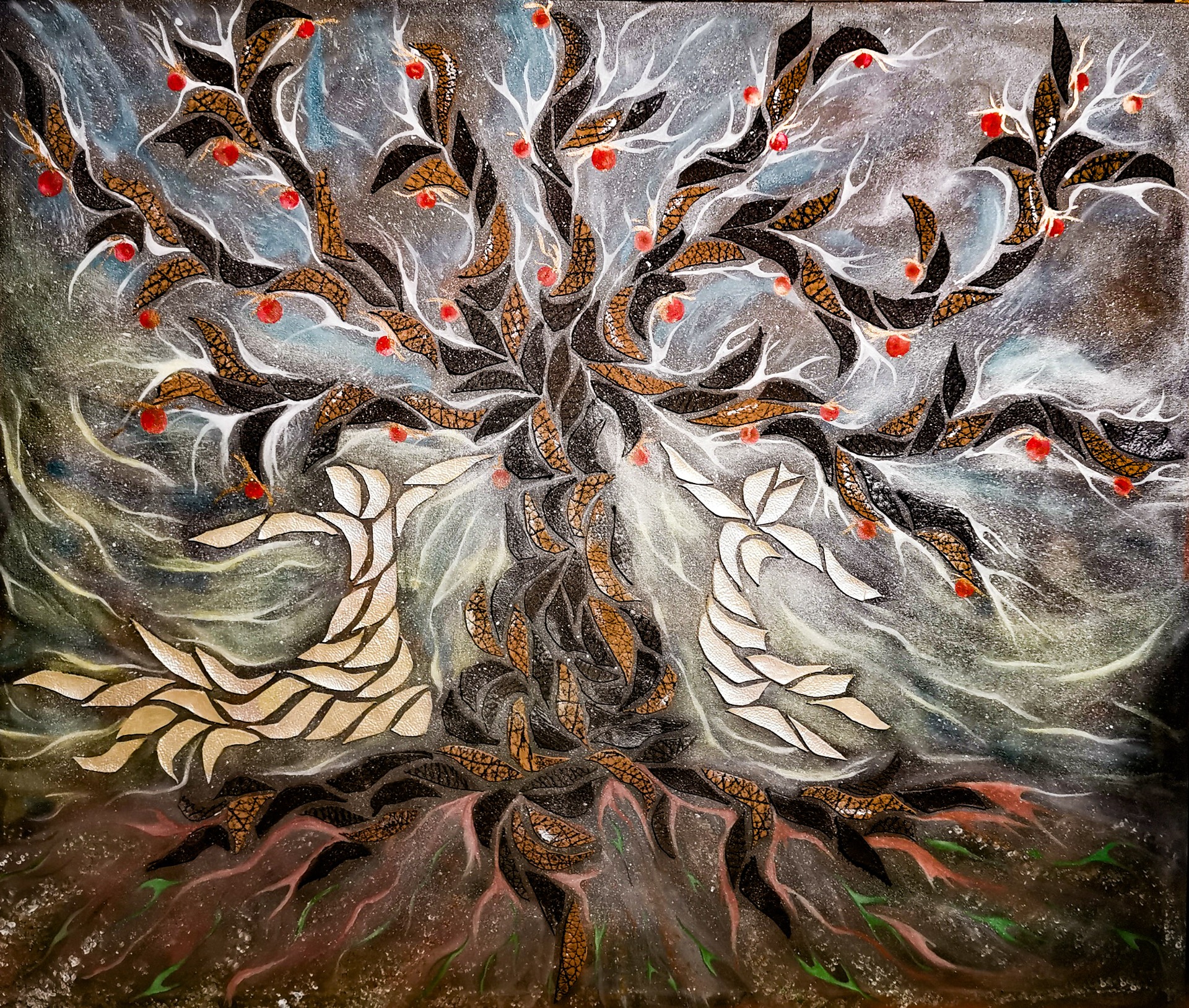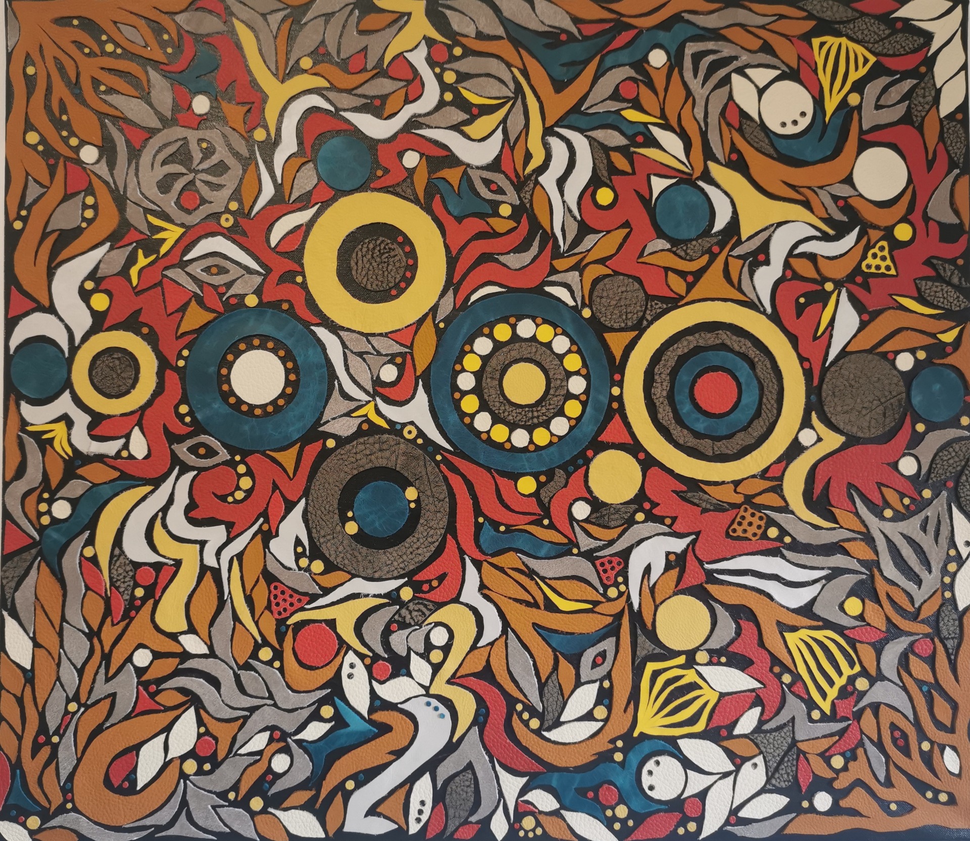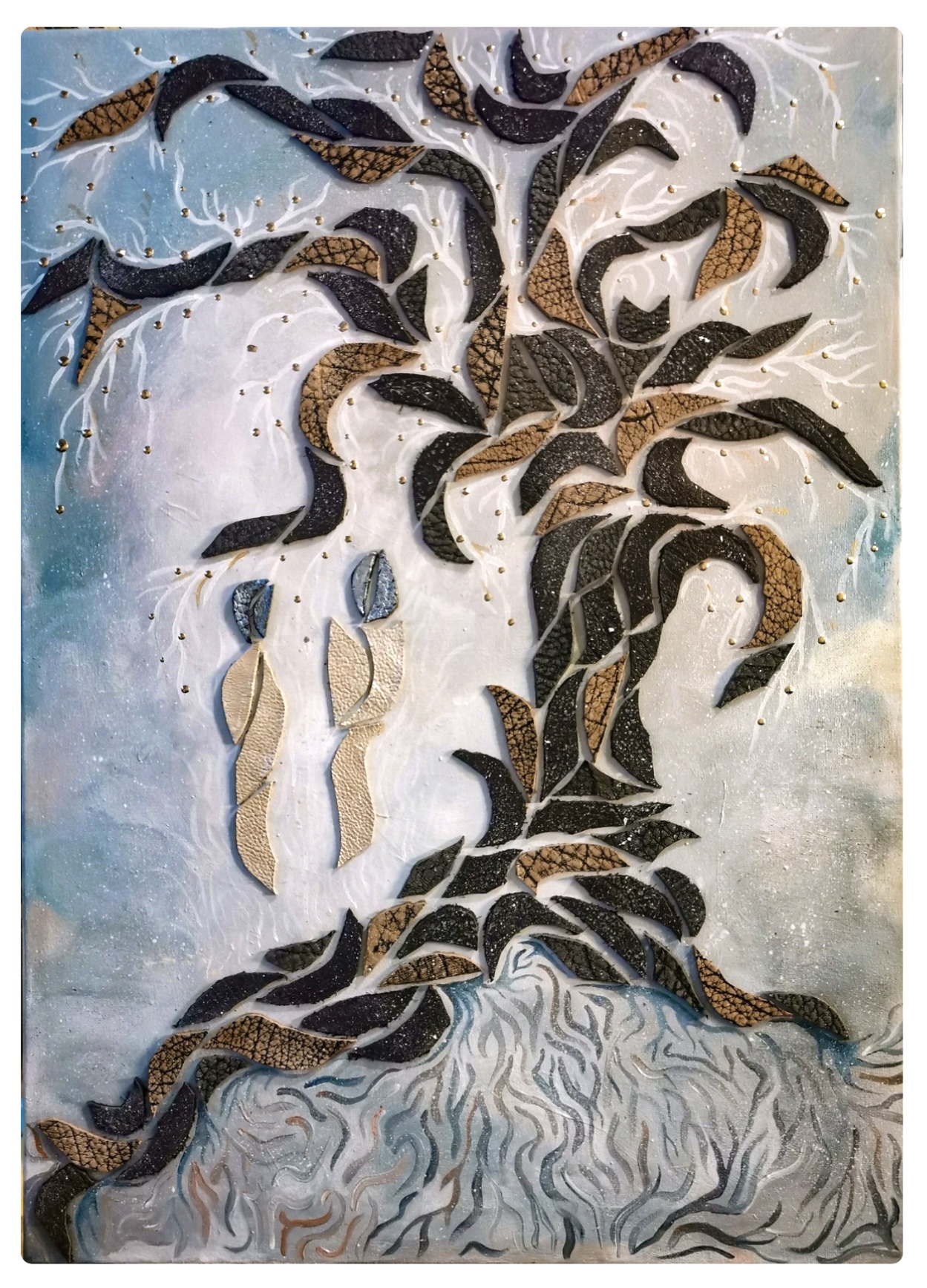 malba akrylem a koláž z hovězí kůže