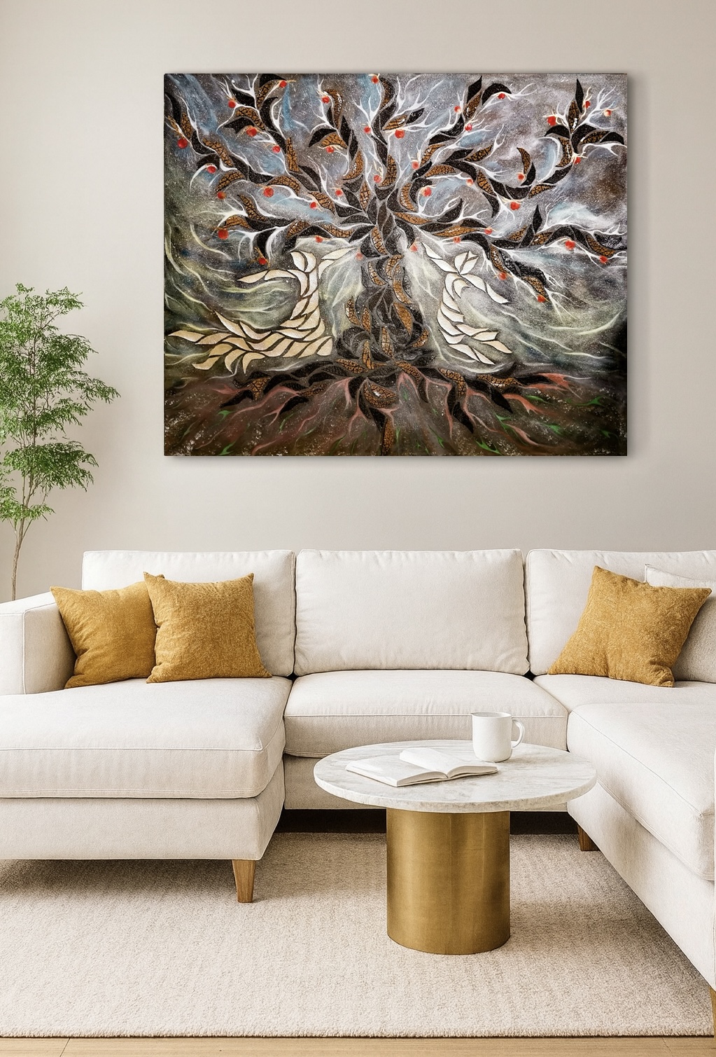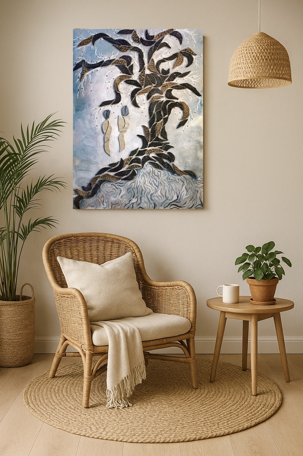 Tam, kde tančí duše ve stínu prastarého stromu, začíná Ráj. Tento obraz zachycuje dokonalou rovnováhu – místo, kde je vše v souladu: láska, klid i spravedlnost. Zemitá hnědá uzemňuje, černá dává hloubku nekonečna a červená přináší vášeň a sílu mocné lásky a poznání.