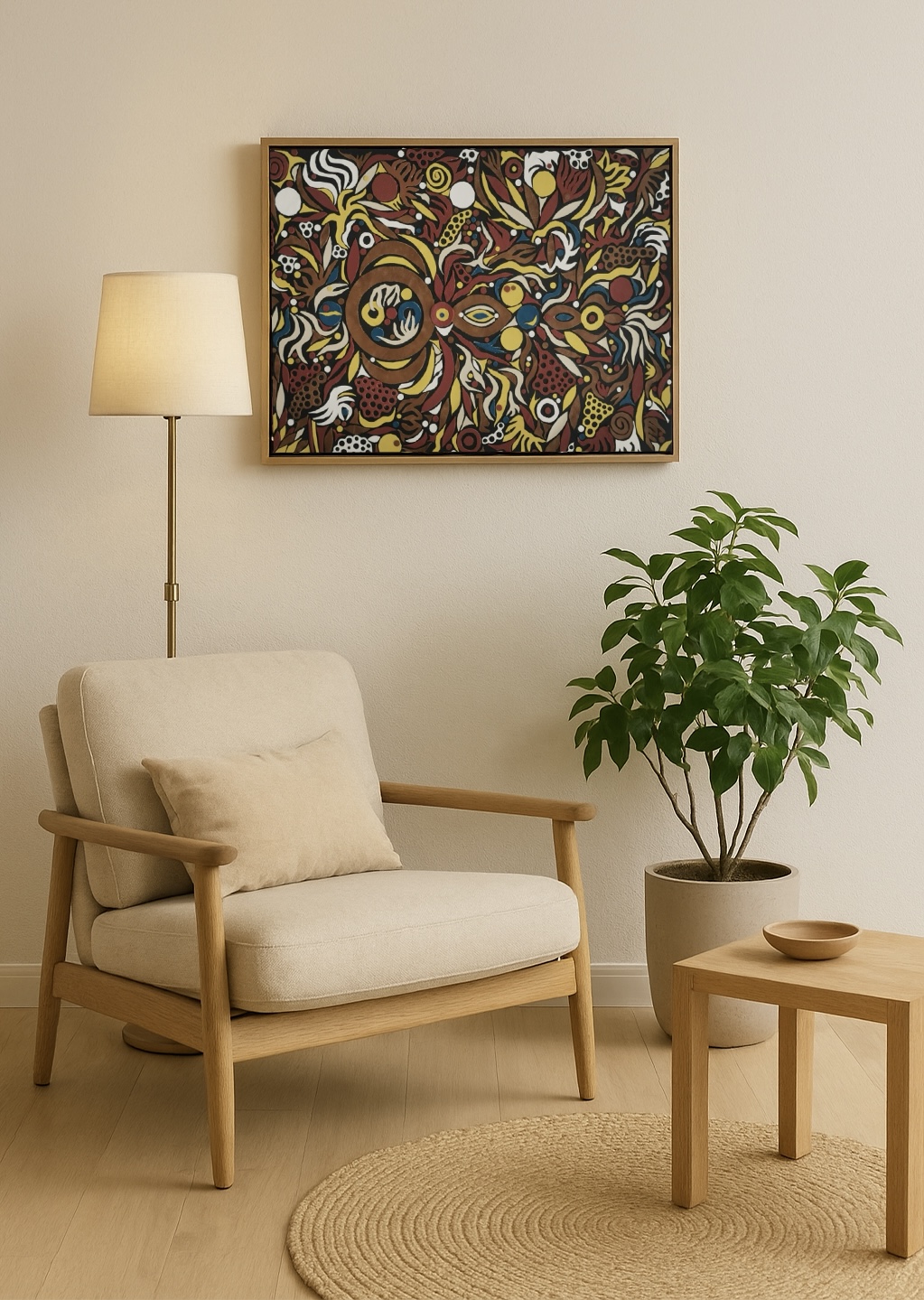 Vhodný do prostoru, kde se tvoří nápady a kde je čas na krátké zastavení. Obraz, který nechává promlouvat vaše vlastní radostné příběhy.